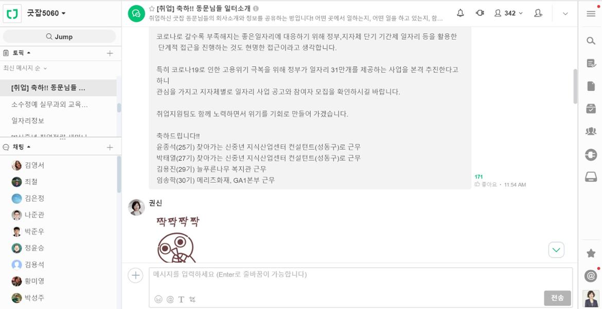 노유진 팀장: <굿잡 5060>은 오프라인 외에 ‘스터디위즈’ 교육플랫폼과 ‘워크위즈’ 채용플랫폼이 있다. 업무를 공유할 수 있는 ‘잔디’라는 온라인 협업 툴도 제공하고 있다. 언택트 시대에 많은 사랑을 받는 프로그램인 ‘잔디’에서는, 실시간 업무내용을 공유하고 처리할 수 있고, 이전 내용도 한눈에 확인할 수 있다. <굿잡 5060> 동문에게는 무료로 제공하고, 기수별로 초대하여 수업내용을 공유하고 있다.