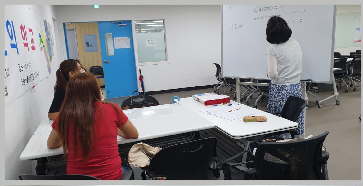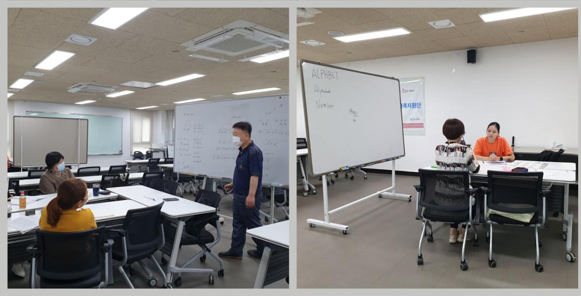 역시 넓은 강의실에서도 ‘사회적 거리두기’는 예외가 없었습니다. 큰 강의실을 삼등분하듯 나누어 한국어(토픽), 영어, 수학 수업이 따로 진행되었습니다. 두 시간 동안 마스크를 쓰는 것만으로도 힘든데 하나라도 더 가르쳐주기 위해 열정을 아낌없이 쏟아내고 계시는 선생님들, 그에 뒤질세라 초롱초롱한 눈빛으로 학구열을 불태우는 30대 초중반 학생들의 모습이 감동적이었습니다.
