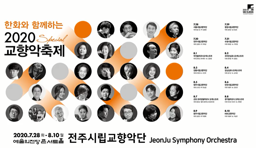 한화가 후원한 2020 교향악 스페셜이 7/28~8/10에 걸쳐 예술의 전당에서 열렸다. 이때 생중계 관람 방식이 3가지였다. 첫째, 티켓을 구매하여 예술의 전당 콘서트 홀에서 관람한다. 둘째, 예술의 전당 야외광장에서 대형스크린으로 생중계를 즐긴다. 셋째, 네이버공연 라이브를 활용하여 온라인으로 원하는 장소에서 관람한다. 지난 공연은 예술의 전당 홈페이지에서 9월 10일까지 다시 볼 수 있다. 예전과 달리 이젠 정보만 알면 무료로 클래식 공연을 즐길 수 있다.