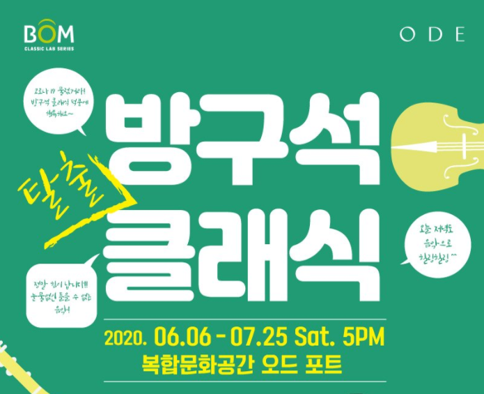 공연기획사 봄아트프로젝트는 서울 강남구 신사동의 복합문화공간 ‘오드 포트’에서 지난 6월 6일 시작해 7월 25일까지 토요일마다 이어지는 ‘방구석 탈출 클래식’ 공연을 개최했다. 첼리스트 이호찬, 바이올리니스트 이재형, 피아니스트 김기경 등이 연주자로 참여했다. 관람객을 30명만 받는 미니 콘서트이다. 오프라인 공연인데도 온라인 채팅방을 마련해 현장에서 관객이 직접 이야기를 하지 않고도 예술가와 소통할 수 있었다. ‘관객 30명’ 공연은 기획사와 예술가가 단기간의 금전적 이익에 고집하지 않아서 가능했다. 공연장은 후원받아 마련하고 예술가가 출연료를 낮추어 재능기부를 했다. 문화활동 활성화를 위해 관객의 자발적인 후원과 기부가 요구된다.