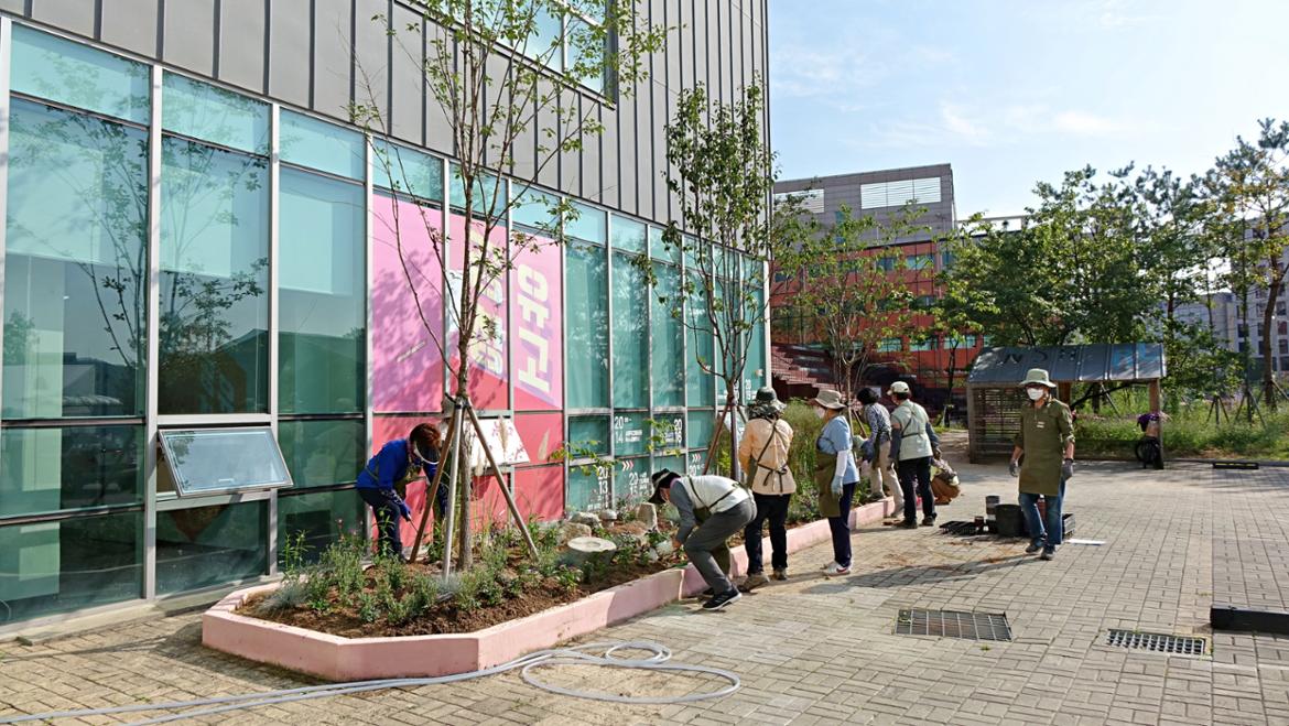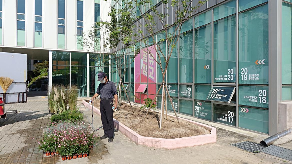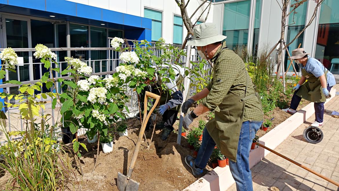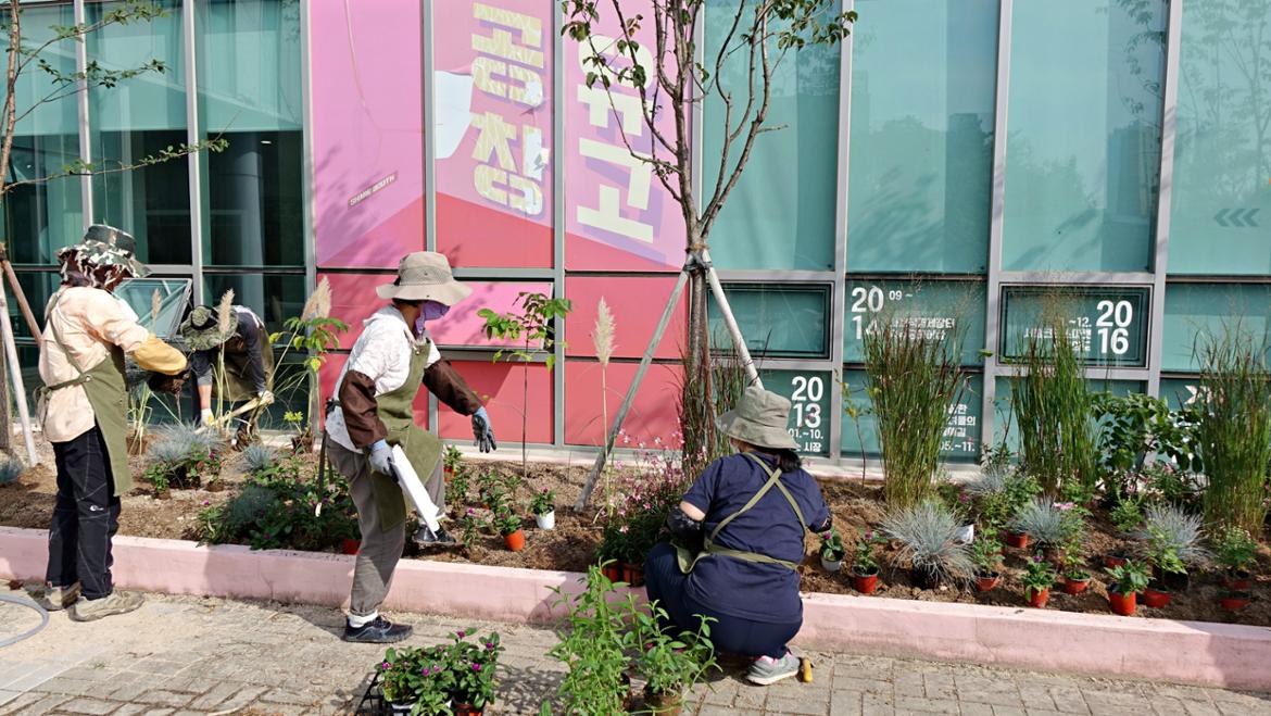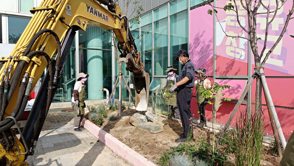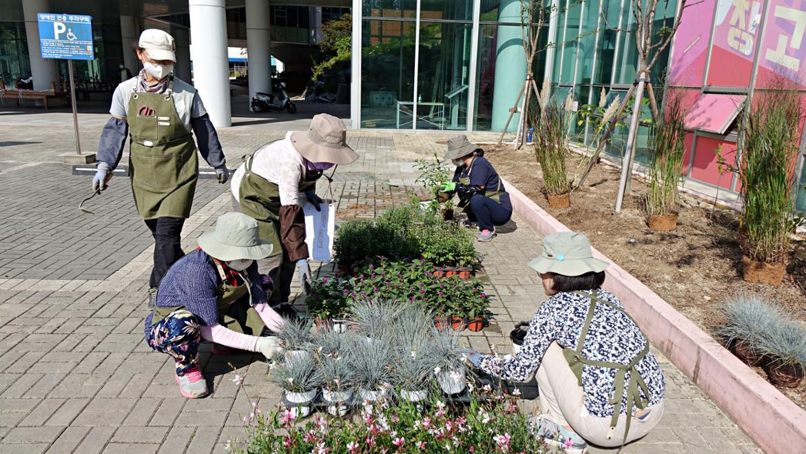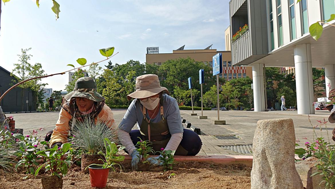서부캠퍼스 이웃인 서울혁신파크 화단이 분주해졌습니다. 캠퍼스의 50+자원봉사단 조경활동가 여러분이 화단을 조성하는 날입니다. 벌써 9월 초에 이미 화단의 흙을 고르고 거름을 주고 조성 계획을 세우면서 활동은 시작되었답니다. 이날은 드디어 화단에 꽃들을 심게 되었죠.