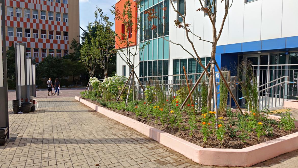 연수동 앞에는 하얀 수국과 보랏빛으로 피어날 꽃들을 심어 가을의 정취를 자아내게 하고, 황화코스모스를 추가하여 환한 느낌도 배가했다.