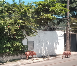 거리를 활보하는 돼지와 버스 안의 개폐기