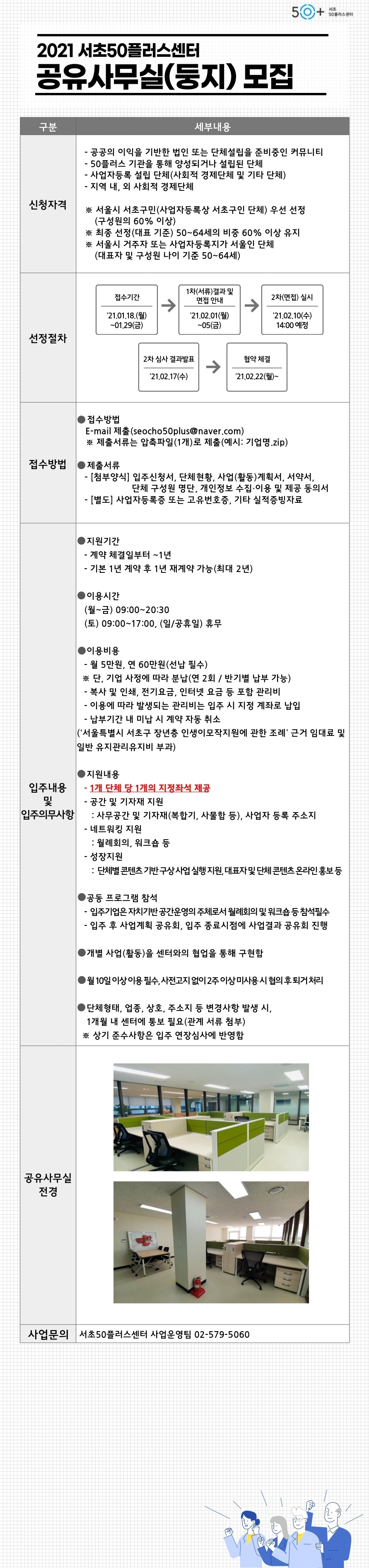 • 첨부파일표시 아이콘2021년 서초50플러스센터 공유사무실(둥지) 모집 공고문 및 신청서.hwp