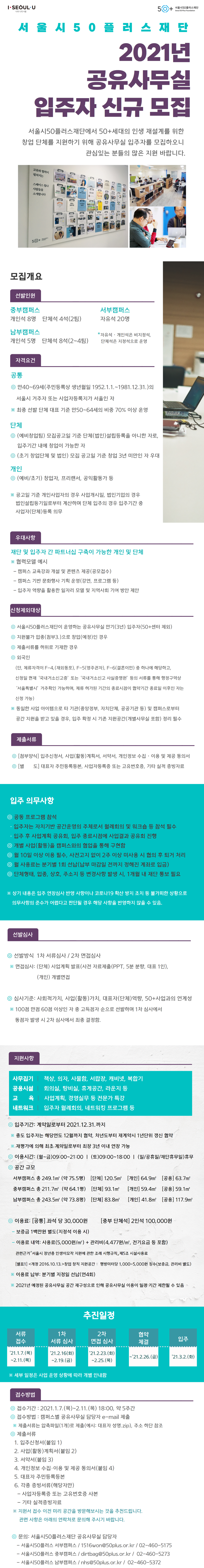 ※ 서울시50플러스 북부캠퍼스 공유사무실(35석)은 2월 모집, 3월 선발, 4월 입주 예정