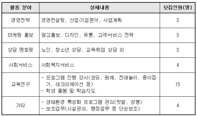 비영리단체, 사회적기업, 공공기관 등 전문 인력이 필요한 참여기관에서 재능을 활용할 수 있는 해당분야 경력 3년 이상, 만 50세 이상의 퇴직자로서 생계보다는 사회공헌에 관심이 많은 자