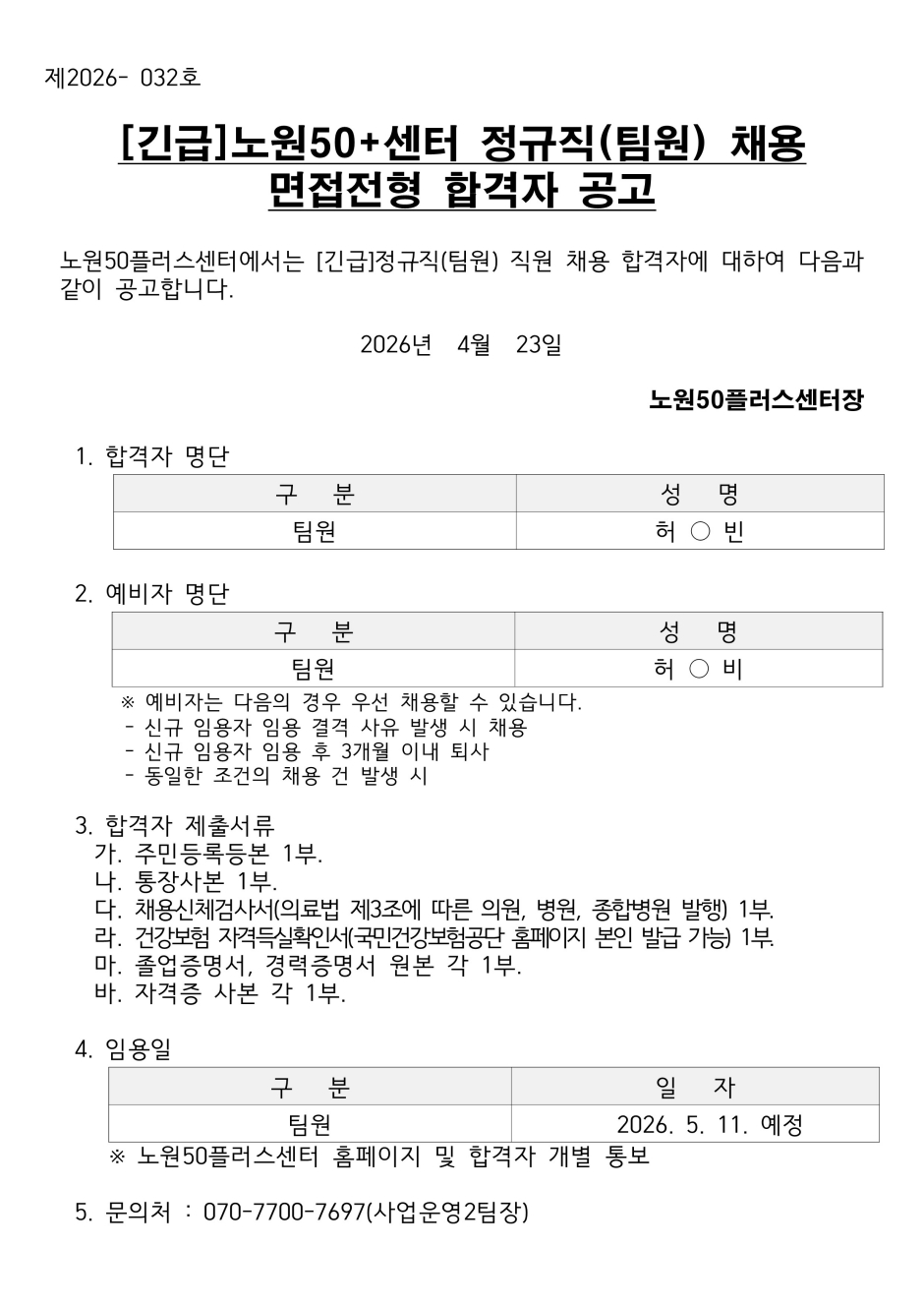 [긴급]노원50+센터 정규직(팀원) 채용 면접전형 합격자 공고