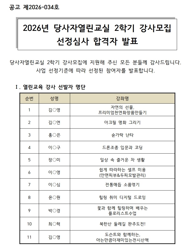 2026년 당사자열린교실 2학기 강사모집 선정심사 최종 합격자 발표
