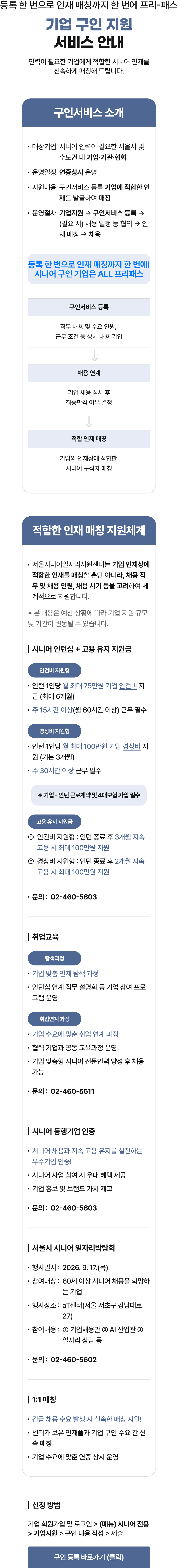 등록 한 번으로 인재 매칭까지 한 번에 프리패스 기업 구인 지원 서비스 안내 인력이 필요한 기업에게 적합한 시니어 인재를 신속하게 매칭해 드립니다. 구인서비스 소개 대상기업 시니어 인력이 필요한 서울시 및 수도권 내 기업·기관·협회 • 운영일정 연중상시 운영 • 지원내용 구인서비스 등록 기업에 적합한 인재를 발굴하여 매칭 · 운영절차 기업지원 구인서비스 등록 (필요시) 채용 일정 등 협의 인재 매칭 채용 등록 한 번으로 인재 매칭까지 한번에! 시니어 구인 기업은 ALL 프리패스 구인서비스 등록 채용연계 적합 인재 매칭 직무내용 및 수요 인원, 근무 조건 등 상세 내용 기입 기업 채용 심사 후 최종합격 여부 결정 기업의 인재상에 적합한 시니어 구직자 매칭 적합한 인재 매칭 지원체계 • 서울시니어일자리지원센터는 기업 인재상에 적합한 인재를 매칭할 뿐만 아니라, 채용 직무 및 채용인원, 채용 시기 등을 고려하여 체계적으로 지원합니다. ※ 본 내용은 예산 상황에 따라 기업 지원 규모 및 기간이 변동될 수 있습니다. 시니어 인턴십 + 고용유지지원금 인건비 지원형 인턴 1인당 월 최대 75만원 기업 인건비 지급 (최대 6개월) • 주 15시간 이상(월 60시간 이상) 근무 필수  경상비 지원형 인턴 1인당 월 최대 100만원 기업 경상비 지원 (기본 3개월)  주 30시간 이상 근무 필수 ※기업 - 인턴근로계약 및 4대보험 가입 필수 고용유지지원금 1 인건비 지원형 : 인턴 종료 후 3개월 지속 고용 시 최대 100만원 지원 2 경상비 지원형 : 인턴 종료 후 2개월 지속 고용 시 최대 100만원 지원  문의: 02-460-5603 ᅵ취업교육  탐색과정 기업 맞춤 인재 탐색 과정 인턴십 연계 직무 설명회 등 기업 참여 프로그램 운영 취업연계과정  기업 수요에 맞춘 취업연계과정  협력 기업과 공동교육과정 운영   기업 맞춤형 시니어 전문인력 양성 후 채용 가능 문의: 02-460-5611  시니어 동행기업 인증 시니어 채용과 지속 고용 유지를 실천하는 우수기업 인증!  시니어 사업 참여 시 우대 혜택 제공 기업 홍보 및 브랜드 가치 제고  문의: 02-460-5603 |서울시 시니어 일자리박람회 행사일시: 2026.9.17.(목)  참여대상: 60세 이상 시니어 채용을 희망하는 기업  행사장소 : aT센터(서울 서초구 강남대로27) 참여내용: 1 기업채용관 2 AI 산업관 3 일자리 상담 등  문의: 02-460-5602 ᅳ 1:1 매칭  긴급 채용 수요 발생 시 신속한 매칭 지원!  센터가 보유 인재풀과 기업 구인 수요 간 신속 매칭  기업 수요에 맞춘 연중 상시 운영 ᅵ신청 방법 기업회원가입 및 로그인 > (메뉴) 시니어 전용 > 기업지원 > 구인 내용 작성 > 제출 구인등록 바로가기 (클릭) 구인 등록 바로가기 (클릭)