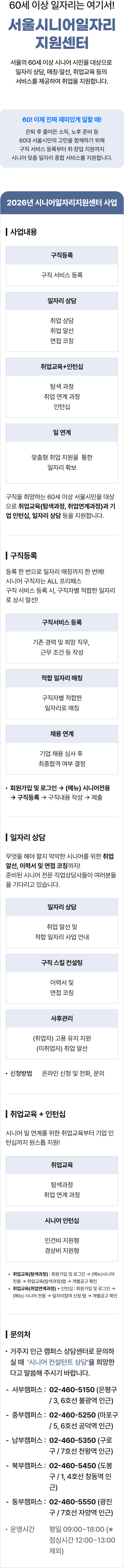 60세 이상 일자리는 여기서! 서울시니어일자리지원센터 서울의 60세 이상 시니어 시민을 대상으로 일자리 상담, 매칭·알선, 취업교육 등의 서비스를 제공하여 취업을 지원합니다. 60! 이제 진짜 재미있게 일할 때! 은퇴 후 줄어든 소득, 노후 준비 등 60대 서울시민의 고민을 함께하기 위해 구직 서비스 등록부터 취·창업 지원까지 시니어 맞춤 일자리 종합 서비스를 지원합니다. 2026년 서울시니어일자리지원센터 사업 | 사업내용 구직등록 일자리 상담 취업교육+인턴십 일 연계 구직 서비스 등록 취업 상담 취업 알선 면접 코칭 탐색 과정 취업 연계 과정 인턴십 맞춤형 취업 지원을 통한 일자리 확보 구직을 희망하는 60세 이상 서울시민을 대상으로 취업교육(탐색과정, 취업연계과정)과 기업 인턴십, 일자리 상담 등 을 지원합니다. | 구직등록 등록 한 번으로 일자리 매칭까지 한 번에! 시니어 구직자는 ALL 프리패스 구직 서비스 등록 시, 구직자별 적합한 일자리로 상시 알선! 구직서비스 등록 기존 경력 및 희망 직무, 근무 조건 등 작성 적합 일자리 매칭 채용 연계 기업 채용 심사 후 최종합격 여부 결정 구직자별 적합한 일자리로 매칭 • 회원가입 및 로그인 → (메뉴) 시니어 전용 → 구직등록 구직내용 작성 → 제출 | 일자리 상담 무엇을 해야 할지 막막한 시니어를 위한 취업 알선, 이력서 및 면접 코칭까지! 준비된 시니어 전문 직업상담사들이 여러분들을 기다리고 있습니다. 일자리 상담 취업 알선 및 맞춤형 일자리 상담 진행 신청방법 온라인 신청 및 전화, 문의 구직 스킬 컨설팅 이력서 및 면접 코칭 사후관리 (취업자) 고용 유지 지원 (미취업자) 취업 알선 |취업교육 + 인턴십 시니어 일 연계를 위한 취업교육부터 기업 인턴십까지 원스톱 지원! 취업교육 탐색 과정 취업 연계 과정 시니어 인턴십 인건비 지원형 경상비 지원형 • 취업교육(탐색과정) : 회원가입 및 로그인 → (메뉴)시니어 전용 → 취업교육(탐색과정) 탭 → 개별공고 확인 • 취업교육(취업연계과정) + 인턴십 : 회원가입 및 로그인 → (메뉴) 시니어 전용 일자리 참여 신청 탭 개별공고 확인 | 문의처 • 거주지 인근 캠퍼스 상담센터로 문의하실 때 '시니어 컨설턴트 상담'을 희망한다고 말씀해 주시기 바랍니다. 서부캠퍼스: 02-460-5150 (은평구/3, 6호선 불광역 인근) 중부캠퍼스: 02-460-5250 (마포구 / 5, 6호선 공덕역 인근) 남부캠퍼스: 02-460-5350 (구로구 / 7호선 천왕역 인근) 북부캠퍼스: 02-460-5450 (도봉구/1, 4호선 창동역 인근) 동부캠퍼스: 02-460-5550 (광진구 / 7호선 자양역 인근) 운영시간 평일 09:00~18:00 (* 점심시간 12:00~13:00 제외)
